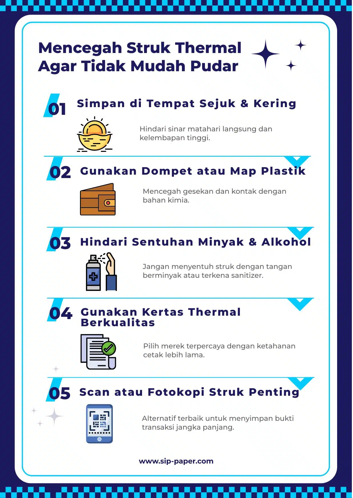 Struk thermal sangat sensitif terhadap suhu dan kelembapan. Paparan sinar matahari langsung dan lingkungan yang panas dapat mempercepat pemudaran tinta pada kertas thermal. Oleh karena itu, simpan struk di tempat yang sejuk dan kering, seperti dalam laci atau kotak penyimpanan yang tertutup rapat. Hindari meletakkan struk di dalam kendaraan yang terkena sinar matahari langsung, karena suhu tinggi dapat mempercepat proses pemudaran tinta.